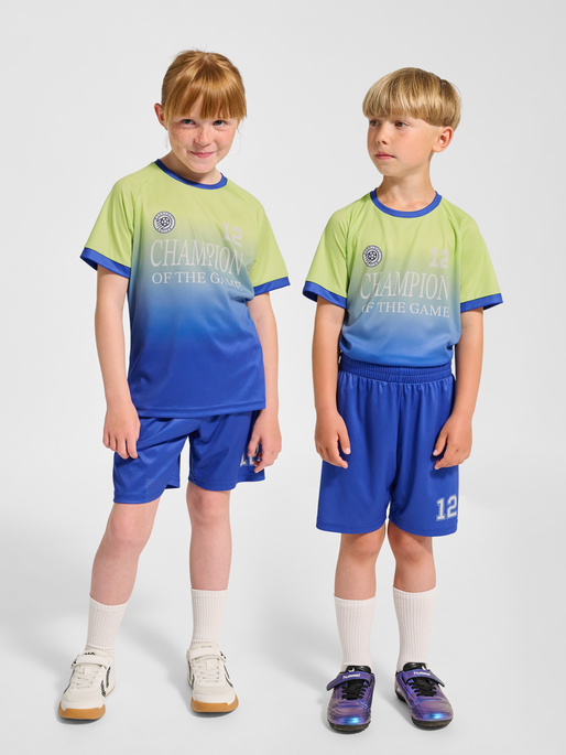 hmlSHIMMER SÆT er et klassisk sportssæt til børn, lavet af et glat og blødt strikket interlock-stof. Det består af shorts og en T-shirt, og glimmer-lignende hummel branddetaljer fuldender looket.